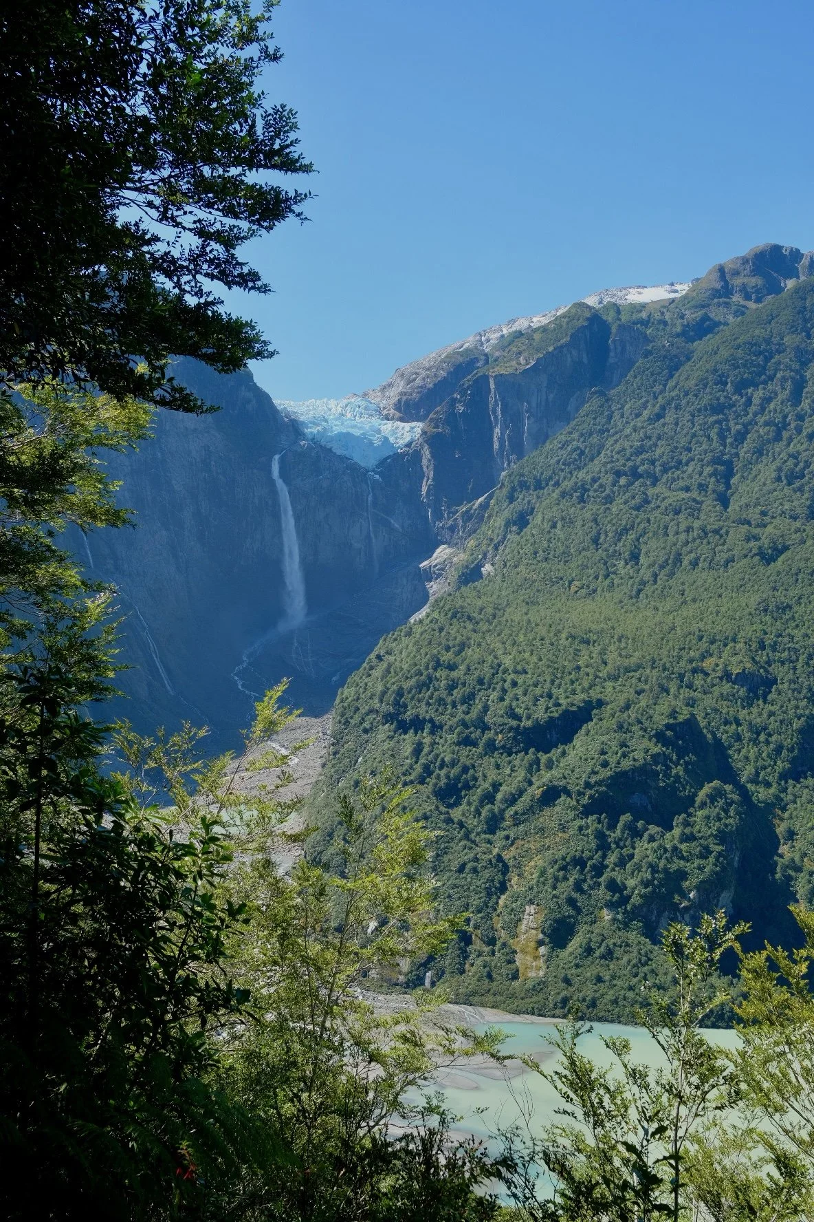 Puyuhuapi is a small fjord village with an unlikely origin: founded in the 1940s by four young Sudeten Germans who arrived by boat having read about settlement opportunities in Patagonia. From there we spent two days in Queulat National Park. Queulat means “sound of waterfalls” in the language of the Chono people. The Ventisquero Colgante — the hanging glacier — is the park’s centrepiece: a mass of ice suspended in a cirque above a vertical rock face, calving into a waterfall that drops to a glacial lagoon below. The scale defeats photography; you stand on the suspension bridge over the Ventisquero River and look up at something that seems structurally improbable. If we had a favourite section of the Carretera, this was it — though not primarily for the glacier.