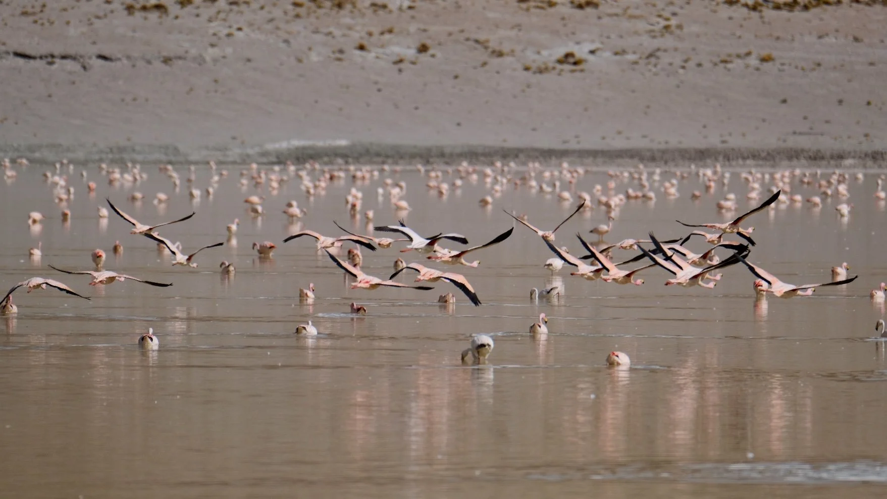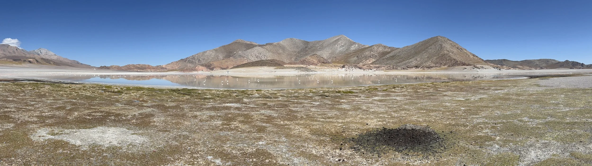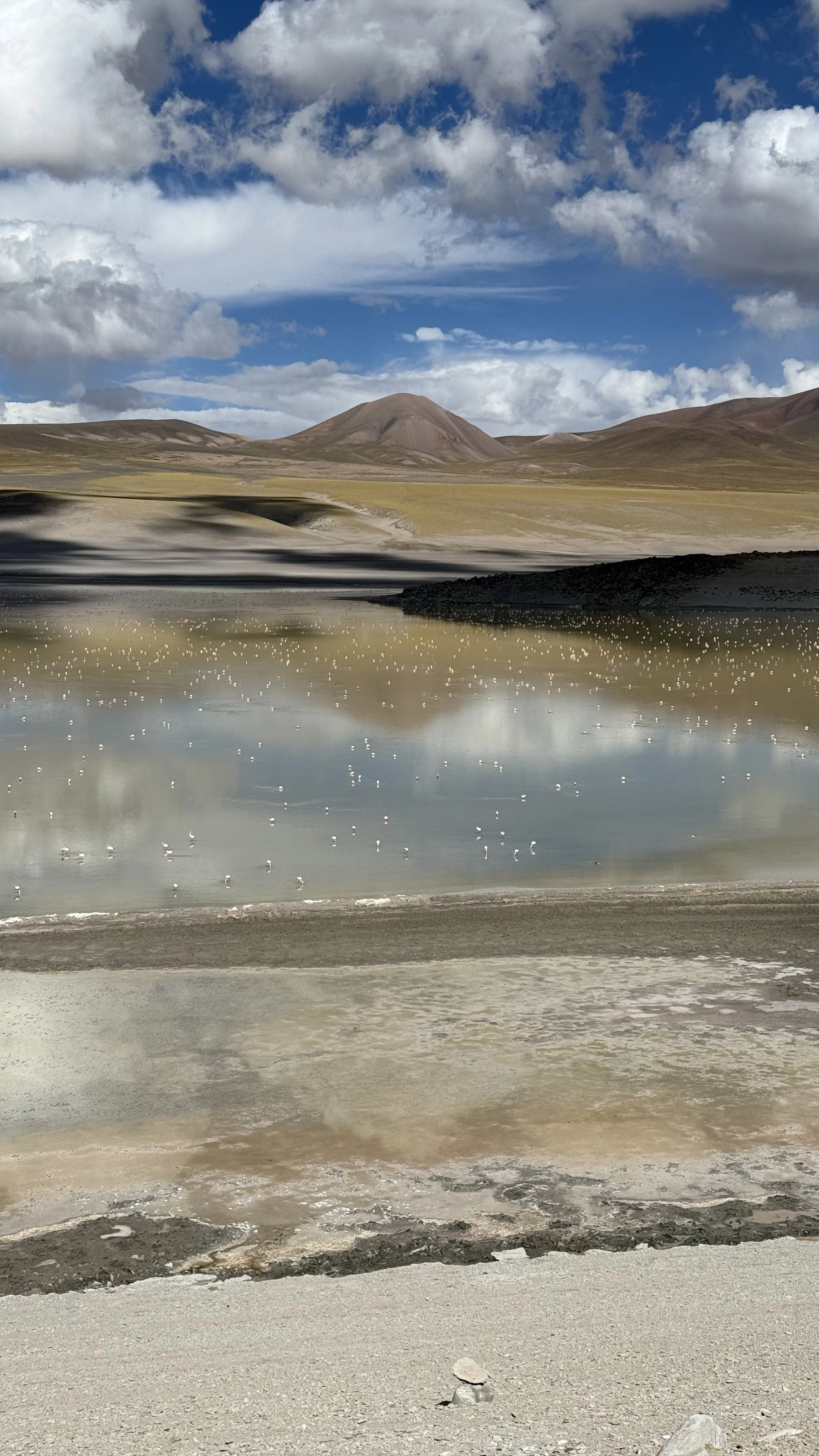 The full improbability of the flamingo as an ecological strategy becomes clear on the Andean puna. Driving south through Chile's Atacama in December, the lakes began delivering more generously — hundreds of Chilean and Puna flamingos at the high altitude salares around San Pedro, the birds scattered across turquoise and rust-coloured water against the volcanic backdrop of the altiplano. The universe, it seemed, was beginning to take the quest seriously.