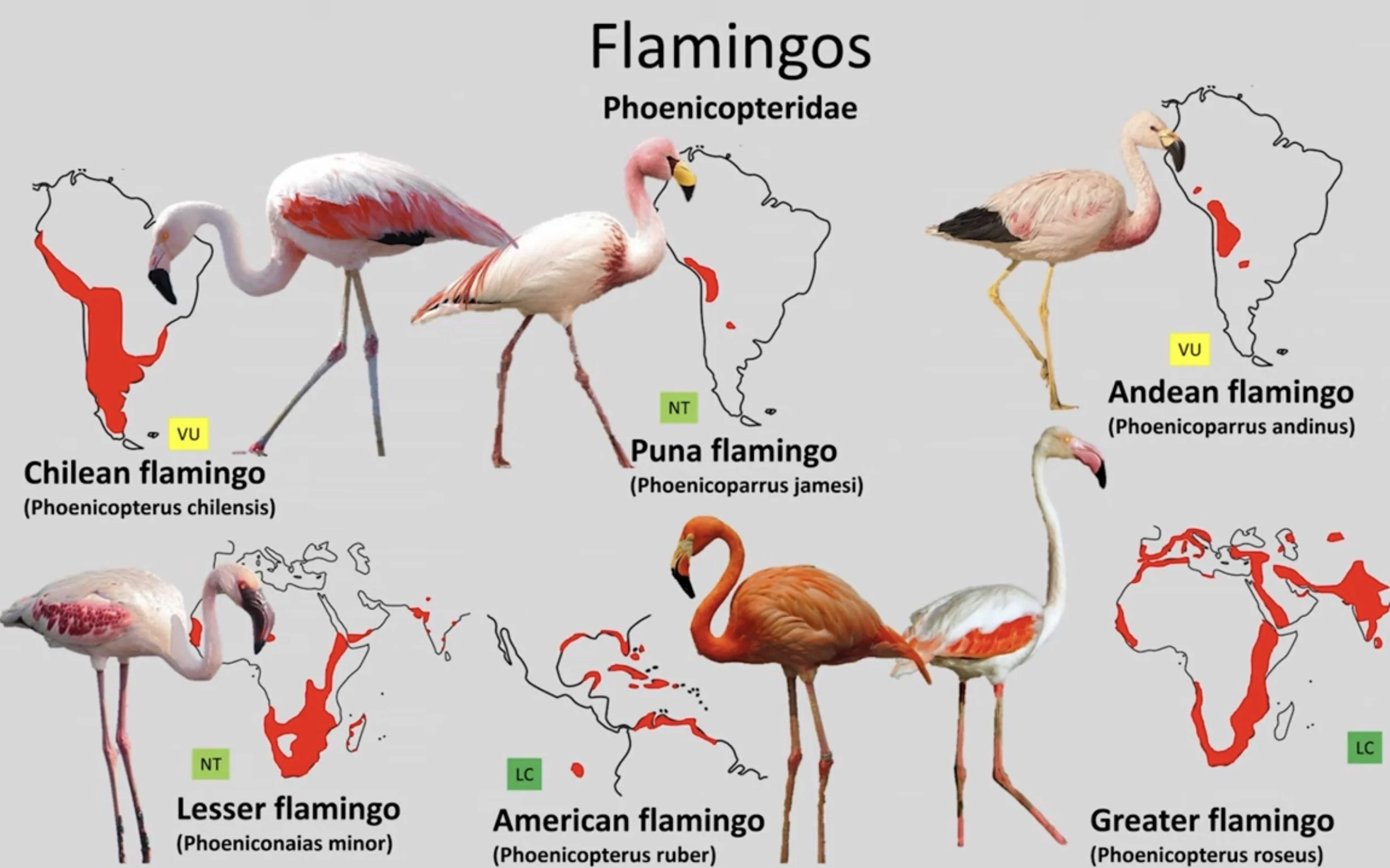 The American (aka Caribbean) flamingo, distinctively the most pink of the six species.