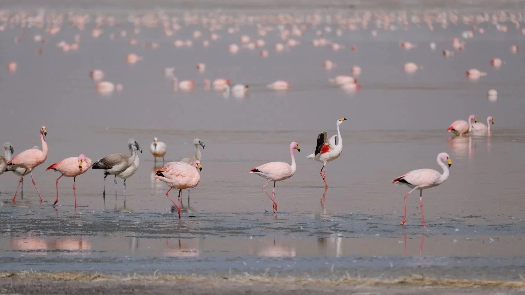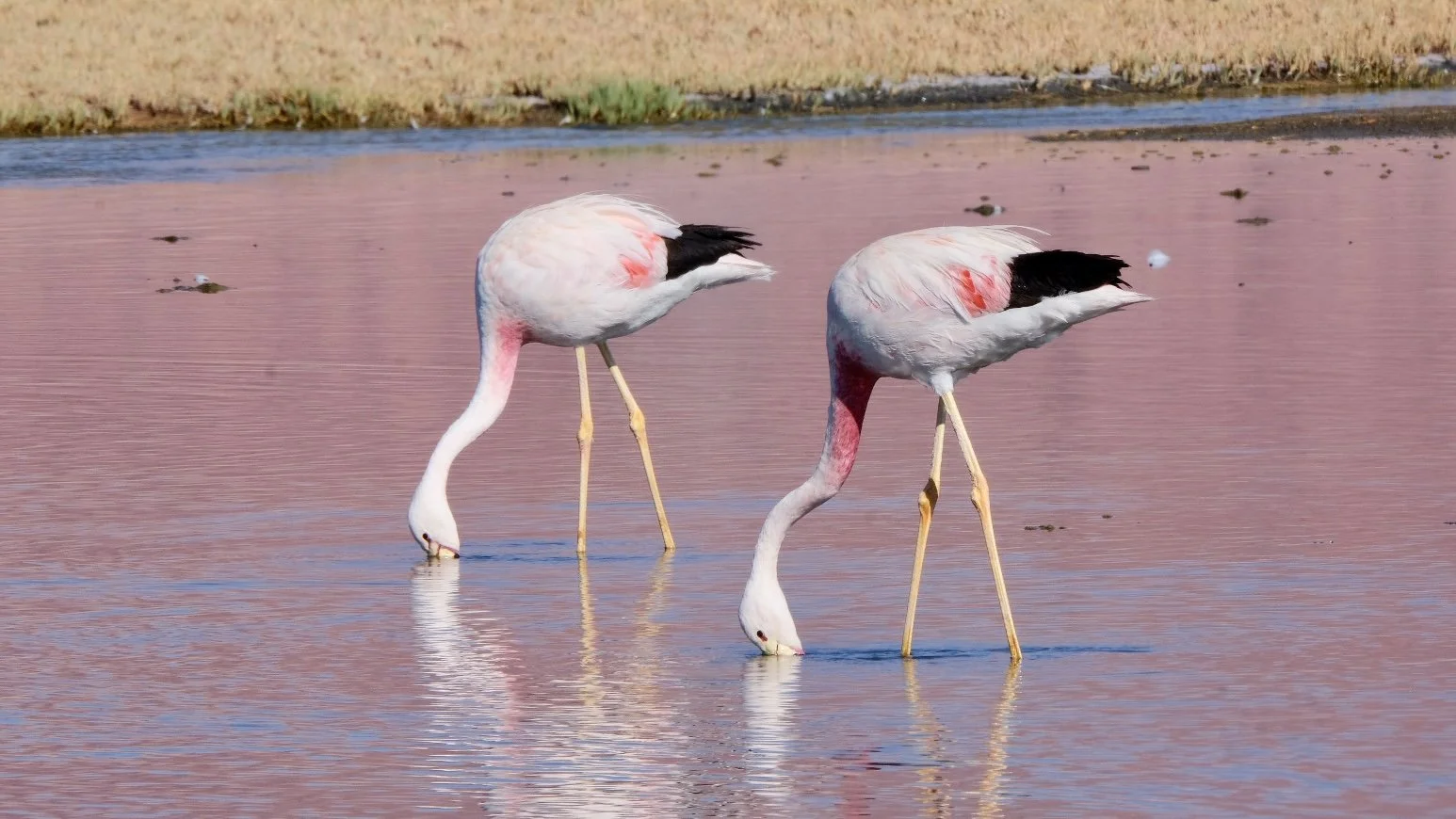 There are three flamingo species on the puna, and all three were present. The Chilean flamingo (Phoenicopterus chilensis) is the most widespread, found from the high Andes to the Patagonian coast — the pinkest of the three, with a grey-pink bill tipped in black and legs with conspicuously pink knee joints that give it a slightly battered appearance, as though it has been kneeling on hard surfaces. The Andean flamingo (Phoenicoparrus andinus) is larger and paler, with a striking black wedge in the rear plumage, yellow legs, and a yellow and black bill — the only flamingo in the world with yellow legs and feet, a detail that seems unnecessarily specific until you are standing at the edge of a mixed colony trying to tell them apart. It is also the rarest flamingo in the world, with a total population of around 39,000 individuals, classified as vulnerable and declining. The Puna flamingo (Phoenicoparrus jamesi), also called James’s flamingo, is the smallest and palest of the three — a bright yellow bill with a black tip, crimson streaking around the eye and on the chest, brick-red legs. It was declared effectively extinct by ornithologists after no confirmed sightings from the 1920s until a breeding colony was discovered in a remote Bolivian salar in 1957, which suggests that ornithologists had simply not been driving across the right salt flats.