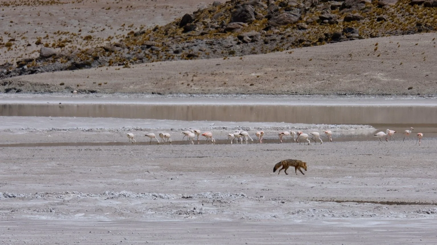 The lake appeared. And on it, in conditions that the word inhospitable fails to fully capture, were perhaps ten to fifteen thousand flamingos. They were not alone. Vicuñas grazed the sparse ichu grass at the lake's margin — the same delicate high-altitude specialists whose domesticated cousins the alpaca we had been seeing since Ecuador. Feral donkeys, descendants of colonial pack animals turned loose at some point in the last five centuries, stood at the water's edge with the philosophical patience of animals that have made their peace with improbable circumstances. And somewhere on the far shore, moving low and purposeful, a culpeo fox was conducting its own assessment of the colony.